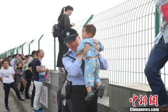 图为:民警在观潮点将江堤护栏上的小孩抱下。杭州警方供图