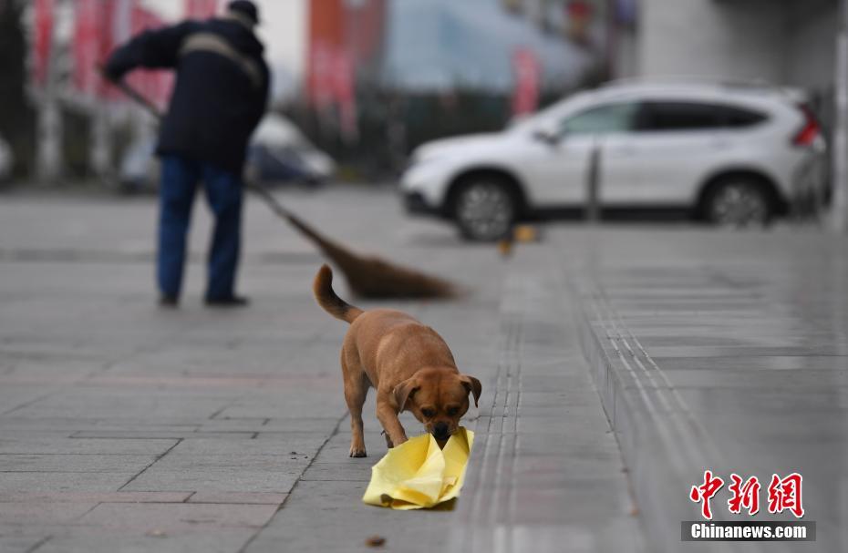 10月11日,长春一家居广场前,小狗“虎子”在帮助主人捡垃圾。“虎子”的主人是一名清扫工,每天早上五点开始工作,小狗“虎子”会不停地帮助主人捡垃圾,无论寒冬酷暑,始终相随,十分感人。中新社记者 张瑶 摄