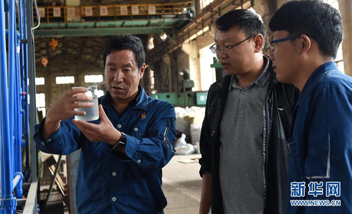 云南冶金昆明重工有限公司首席技师耿家盛(左)在车间里和助手查看生态环保厕所的冲水系统经过循环后的水质(9月22日摄)。新华社记者蔺以光 摄