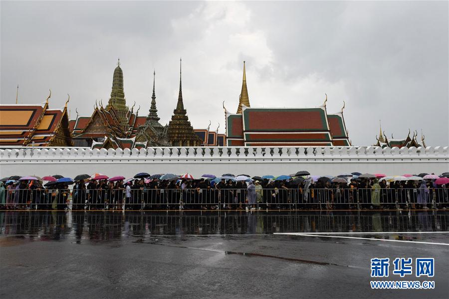 10月13日,在泰国曼谷的大王宫前,民众参加普密蓬国王逝世一周年悼念活动。普密蓬国王于2016年10月13日逝世,享年89岁。新华社记者 李芒茫 摄
