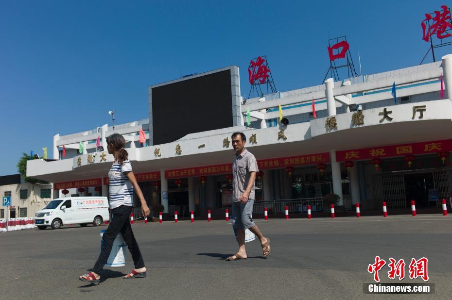 10月14日,海口港客运站前广场两位想过海的旅客拿着行李离开。受今年第20号台风“卡努”影响,14日夜间起,琼州海峡风力增大,为保障航行安全,海南海事部门决定从14日10时起,琼州海峡全线停航,同时粤海铁路跨海旅客列车全部停运。海南省气象局也在13日14时50分变更台风四级预警为台风三级预警,提醒相关部门做好防范。 中新社记者 骆云飞 摄