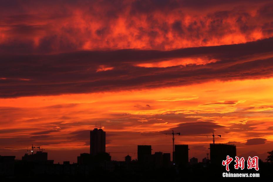 10月15日傍晚,受今年20号台风“卡努”影响,广西钦州市上空出现火烧云景观。 中新社记者 凌福龙 摄