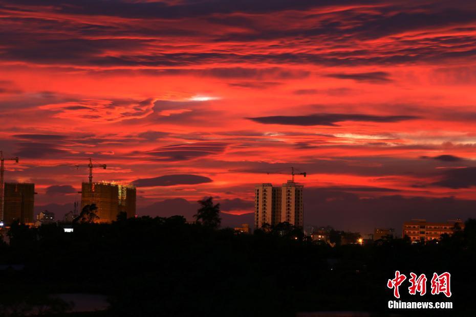 10月15日傍晚,受今年20号台风“卡努”影响,广西钦州市上空出现火烧云景观。 中新社记者 凌福龙 摄