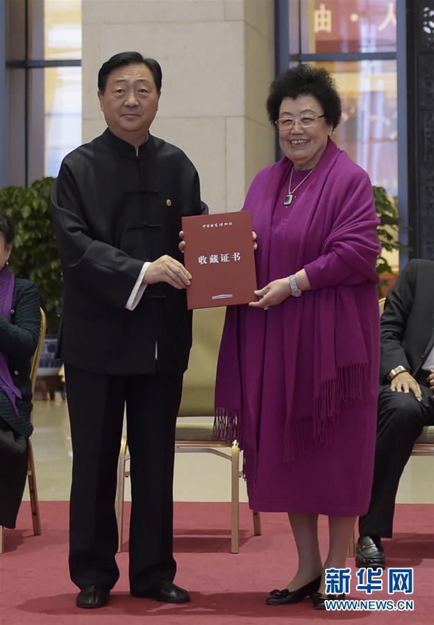 10月15日,中国国家博物馆馆长吕章申(左)向中国紫檀博物馆馆长陈丽华颁发收藏证书。当日,中国国家博物馆在北京举行“柚木贴金天坛祈年殿捐赠收藏仪式”,由中国紫檀博物馆创作捐赠的柚木贴金天坛祈年殿模型正式亮相并入藏中国国家博物馆。据介绍,该模型选用缅甸柚木,由数十名高级技术工人耗时三年多手工创作完成,并粘贴金箔。模型整体结构以原建筑物为参照,以1:10的比例采用中国传统榫卯结构精心雕制,直径9米,高3.8米。新华社记者鲁鹏 摄