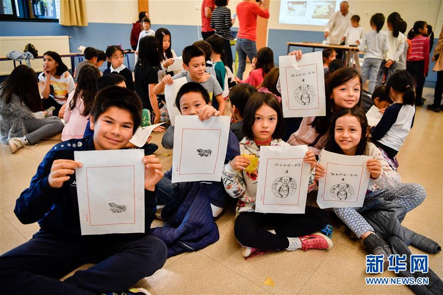 10月19日,在法国圣日耳曼昂莱的让·穆兰小学,学生们展示亲手拓印的作品。新华社记者 陈益宸 摄