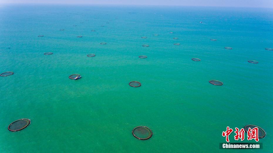 10月19日,记者通过无人机在百米高空航拍位于海南省临高县后水湾附近海域的深水抗风浪网箱养殖基地,据临高县海洋与渔业局工作人员介绍,目前该县共有深海网箱逾3000口,主要分布在后水湾、金牌湾,以养殖金鲳鱼为主,年产量约2.4万吨,年产值7.2亿元人民币,成为亚洲最大深水网箱养殖基地。中新社记者 骆云飞 摄