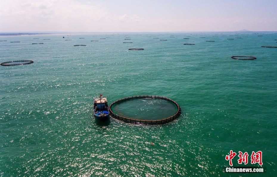10月19日,记者通过无人机在百米高空航拍位于海南省临高县后水湾附近海域的深水抗风浪网箱养殖基地,据临高县海洋与渔业局工作人员介绍,目前该县共有深海网箱逾3000口,主要分布在后水湾、金牌湾,以养殖金鲳鱼为主,年产量约2.4万吨,年产值7.2亿元人民币,成为亚洲最大深水网箱养殖基地。中新社记者 骆云飞 摄