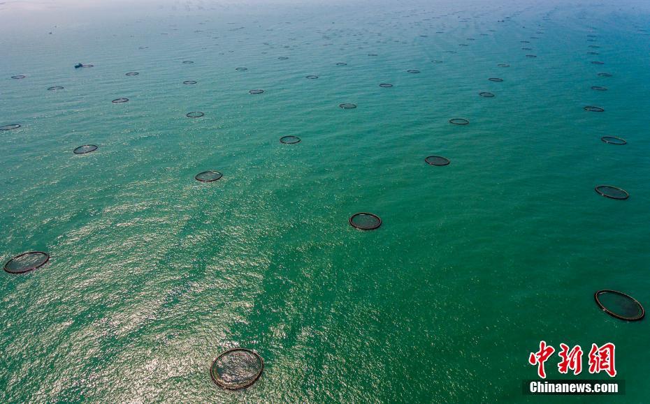 10月19日,记者通过无人机在百米高空航拍位于海南省临高县后水湾附近海域的深水抗风浪网箱养殖基地,据临高县海洋与渔业局工作人员介绍,目前该县共有深海网箱逾3000口,主要分布在后水湾、金牌湾,以养殖金鲳鱼为主,年产量约2.4万吨,年产值7.2亿元人民币,成为亚洲最大深水网箱养殖基地。中新社记者 骆云飞 摄