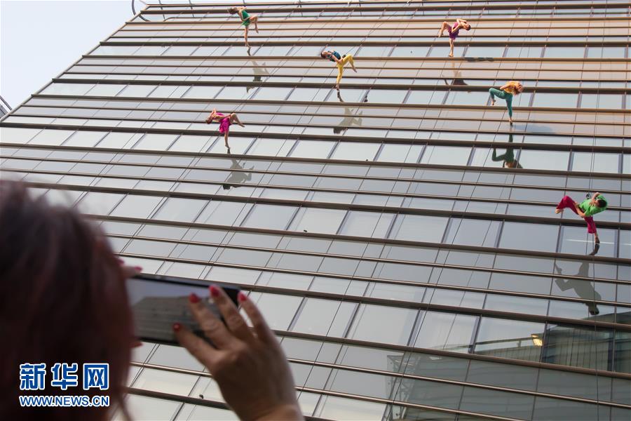 10月20日,在匈牙利首都布达佩斯一栋办公楼的玻璃外墙上,美国BANDALOOP舞蹈团在CAFe布达佩斯当代艺术节上表演垂直舞蹈。舞蹈团演员“飞檐走壁”的绝技令现场观众叹为观止。新华社发(弗尔季·奥蒂洛摄)