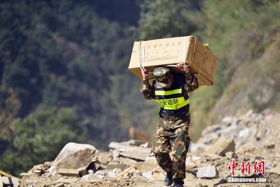 该站驻地樟木镇位于西藏自治区日喀则市聂拉木县中尼边境线上,是连接中国和尼泊尔的重要通商口岸。在2015年的尼泊尔“4·25”地震中,地处峡谷地带的樟木镇受损严重。此后,驻地民众全部被转移,只留下部队官兵们在坚守。因部分运输道路塌方,官兵只能在塌方点徒步搬运。图为正在路过塌方点的官兵。周文元 摄