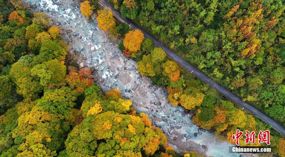 10月21日,四川南江县光雾山景区漫山遍野的枫叶如画,吸引了来自四川、陕西等地的近万游客冒雨赏秋景。图为公路、河流融入秋景,美如画。中新社记者刘忠俊 摄