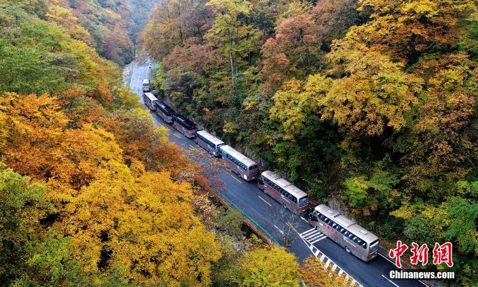10月21日,四川南江县光雾山景区漫山遍野的枫叶如画,吸引了来自四川、陕西等地的近万游客冒雨赏秋景。图为景区内旅游大巴排队等候徒步赏景的游客。中新社记者刘忠俊 摄