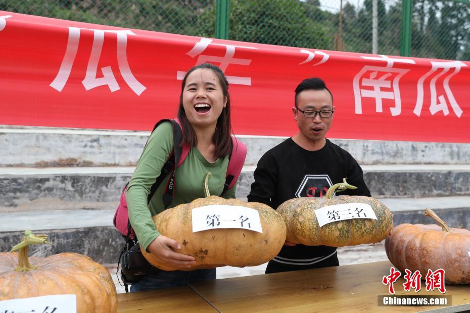 10月24日,两位游客在瓜年节上抱着南瓜王拍照留念。当日,是贵州省雷山县达地水族乡一年一度的瓜年节,当地水族民众身着节日盛装,盛情邀请周边的苗族民众一起,载歌载舞,欢度瓜年节庆祝丰收。中新社记者贺俊怡 摄