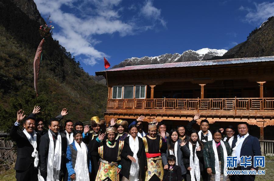 卓嘎、央宗姐妹和玉麦乡干部群众合影(10月29日摄)。
