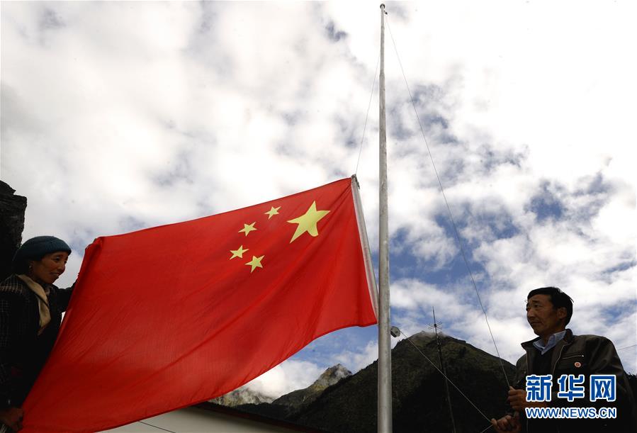 这是时任玉麦乡乡长的卓嘎(左)在乡政府升起国旗(2009年9月9日摄)。
