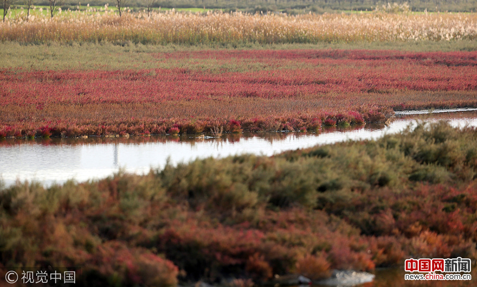 2017年10月29日,山西运城百里盐湖,深秋季节,这里的植被随着天气变冷,变成红色。鲍东升/视觉中国