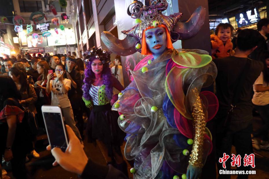 10月31日夜晚,香港兰桂坊酒吧一条街,游人络绎不绝狂欢“万圣节 ”。远近闻名的兰桂坊狂欢“万圣节”每年都吸引世界各地大批游客慕名而来。图为入夜时分,兰桂坊人山人海,各式各样奇装异服上演。中新社记者洪少葵 摄