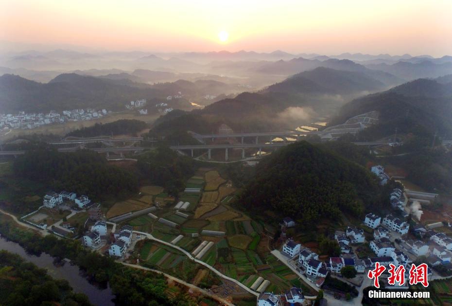 航拍"最美乡村"江西婺源 深秋流雾美如画境