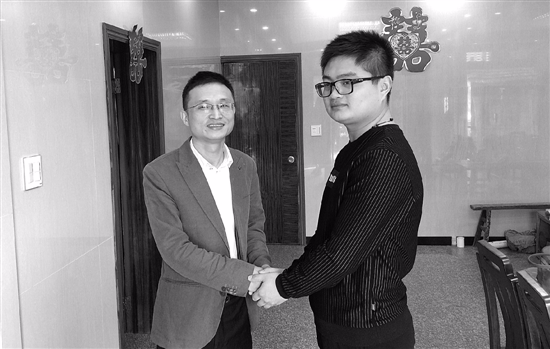 徐国(左)感谢拾金不昧的倪新国。
