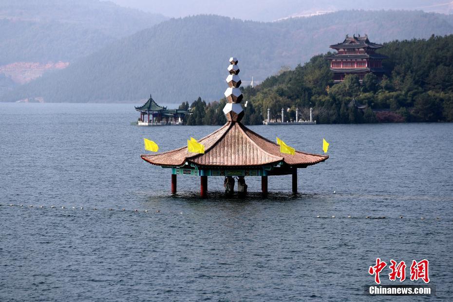 11月5日,河南南阳南水北调中线工程源头丹江口水库水位持续走高,位于丹江大观苑景区的“龙王亭”也被大水淹没,通往“龙王亭”的栈桥已成一片汪洋,孤零零的“龙王亭”只剩下一个盖子在外裸露。据长江水利委员会水文局公布的实时数据显示,丹江口水库持续高水位运行,截至11月5日16时,丹江口水库水位高达166.75米。图为赝本矗立在岛上的“龙王亭”,被大水淹的只剩一个盖子。王中举 摄