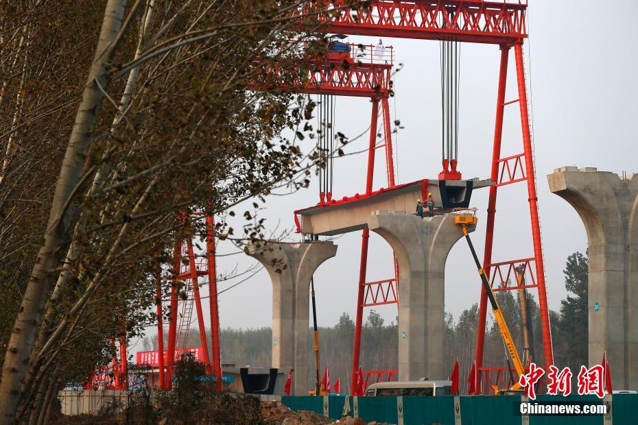 11月6日,北京轨道交通新机场线第一片梁,在大兴区礼贤镇的新机场线土建施工一期工程02标工地开始架设。据悉,架设预计2018年6月30日结束,线路则于2019年与新机场同时运行。北京新机场轨道线设计时速每小时160公里,是目前内地最快的城市轨道交通工程。途经大兴、丰台两个行政区,线路全长41.36km,包括盾构段、高架段,设新机场北航站楼站、磁各庄、草桥三座车站。中新社记者富田 摄