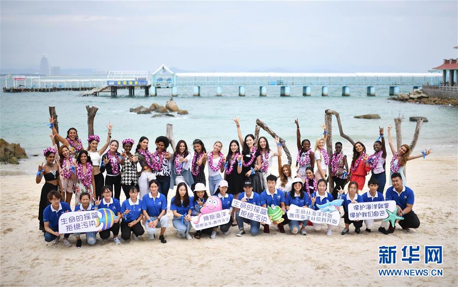 11月8日,进入第67届世界小姐全球总决赛的各国佳丽在三亚蜈支洲岛与蓝丝带海洋保护协会志愿者一起合影。当日,参加2017年第67届世界小姐全球总决赛的各国佳丽在三亚蜈支洲岛景区参观游览,体验南国风情。据了解,第67届世界小姐全球总决赛将于11月18日在三亚举行。新华社记者郭程 摄