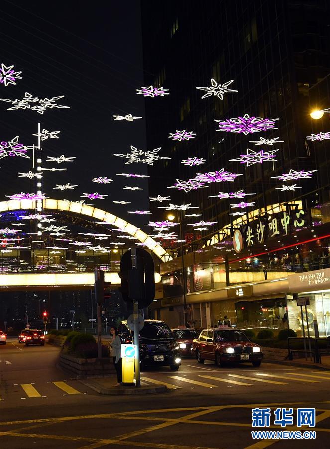 香港尖沙咀东部马路上空悬挂漫天雪花及心形的灯饰(11月8日摄)。临近圣诞节,香港尖沙咀东部,大厦外墙圣诞灯饰闪亮,吸引市民观看。新华社记者 卢炳辉 摄