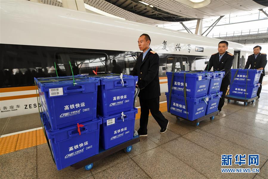 11月9日,工作人员在北京南站站台上运送快件箱。当日,中铁快运联合国内快递服务商,首次在京沪高铁线上推出的“高铁极速达”快运新产品开始试运行。铁路部门利用高铁列车、行李车等铁路快捷运力资源,尤其是在京沪高铁“复兴号”列车上新推出的“高铁极速达”实现了京沪快件10小时内可送达,具有速度快、运行稳等特点。新华社记者陈晔华 摄