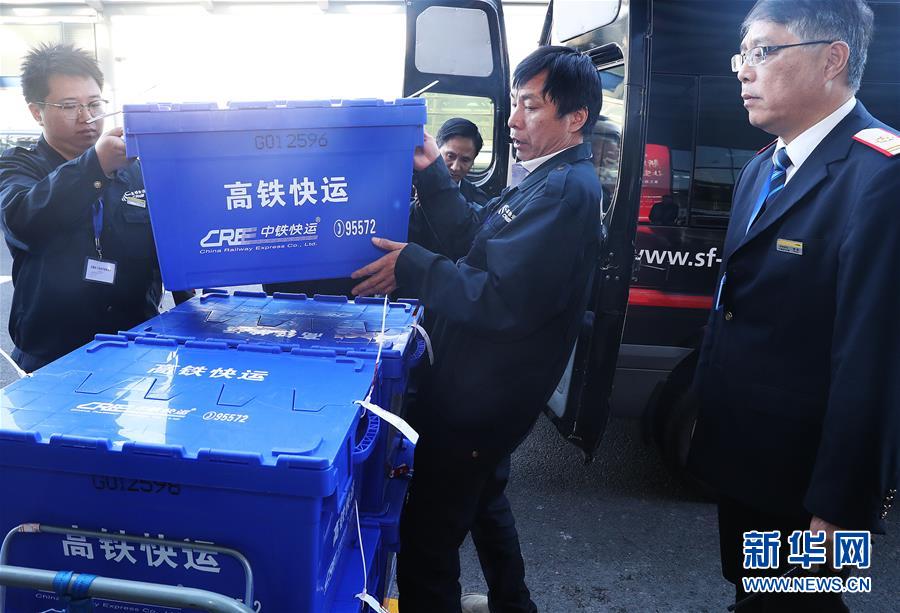 11月9日,工作人员在上海虹桥火车站搬运快运物品。当日,中铁快运联合国内快递服务商,首次在京沪高铁线上推出的“高铁极速达”快运新产品开始试运行。铁路部门利用高铁列车、行李车等铁路快捷运力资源,尤其是在京沪高铁“复兴号”列车上新推出的“高铁极速达”实现了京沪快件10小时内可送达,具有速度快、运行稳等特点。新华社记者陈飞 摄