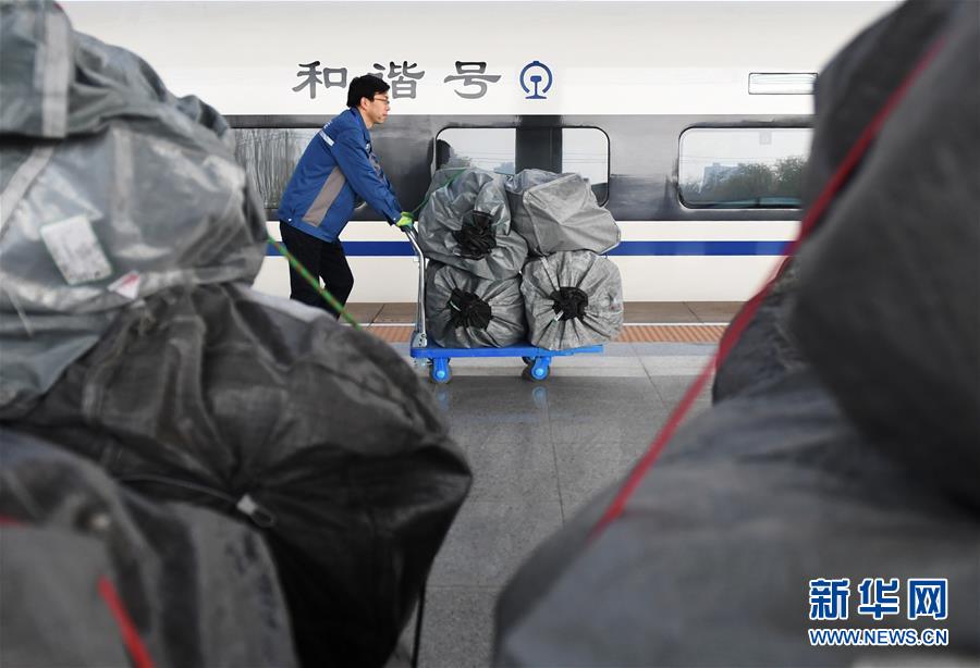11月11日,一名工作人员推运快递包裹装上D2711次动车组列车。