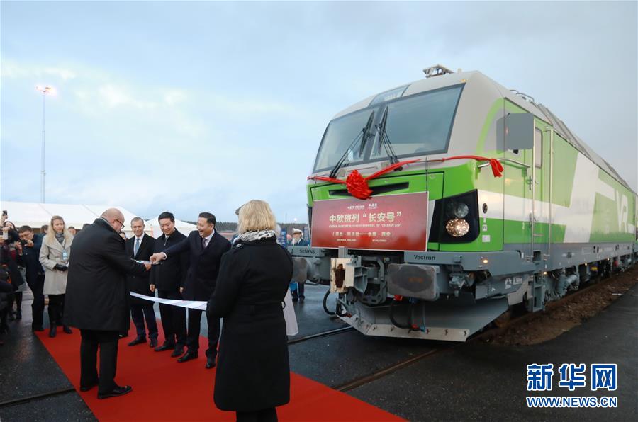 11月10日,在芬兰科沃拉,中国与北欧国家间首趟中欧班列开通典礼举行。一班载有41个集装箱的国际铁路列车10日从芬兰铁路枢纽城市科沃拉驶向终点站西安港。这是中国与北欧国家之间的首趟中欧班列。新华社记者李骥志摄 图片来源:新华网