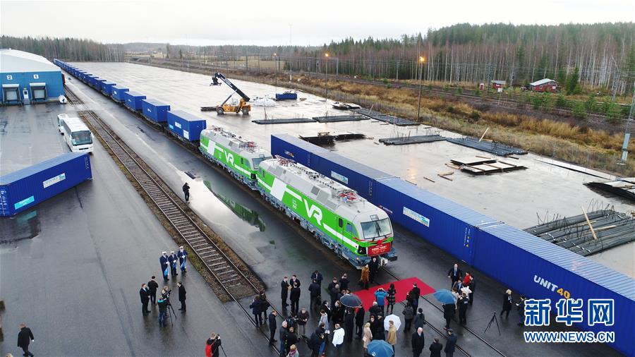 11月10日,在芬兰科沃拉,中国与北欧国家间首趟中欧班列开通典礼举行。一班载有41个集装箱的国际铁路列车10日从芬兰铁路枢纽城市科沃拉驶向终点站西安港。这是中国与北欧国家之间的首趟中欧班列。据介绍,首趟班列主要装载电梯配件等机电设备,还有食品、纸浆等商品,途经芬兰、俄罗斯、哈萨克斯坦,从霍尔果斯口岸入境中国,全程9000多公里,历时16到18天。新华社记者李骥志摄 图片来源:新华网