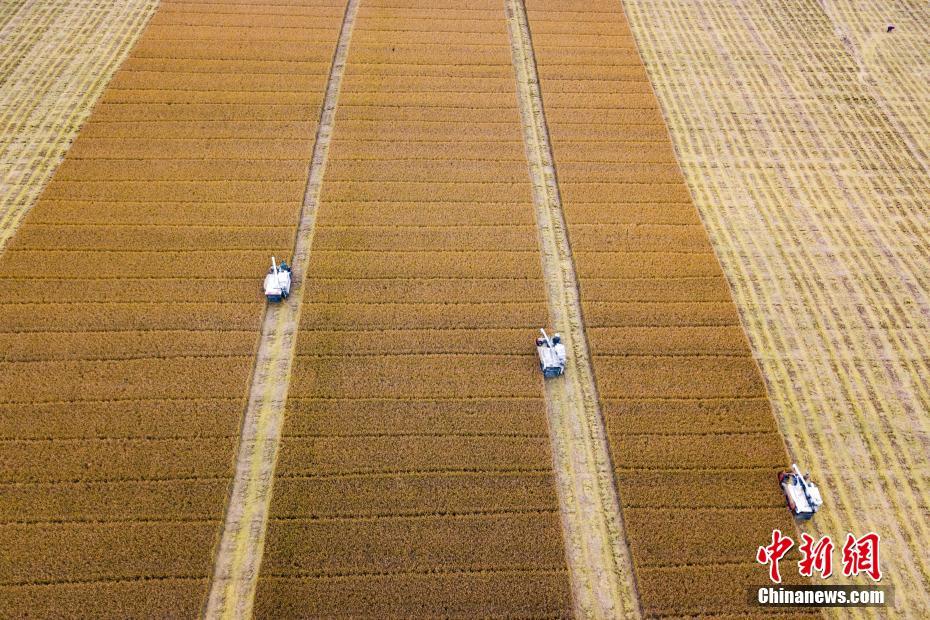 11月12日,航拍江苏淮安郊外田间,收割机正在来回移动收割水稻。眼下正值水稻进入成熟收割期,当地农民纷纷抓住有利天气抢收稻谷,确保颗粒归仓。中新社记者泱波 摄