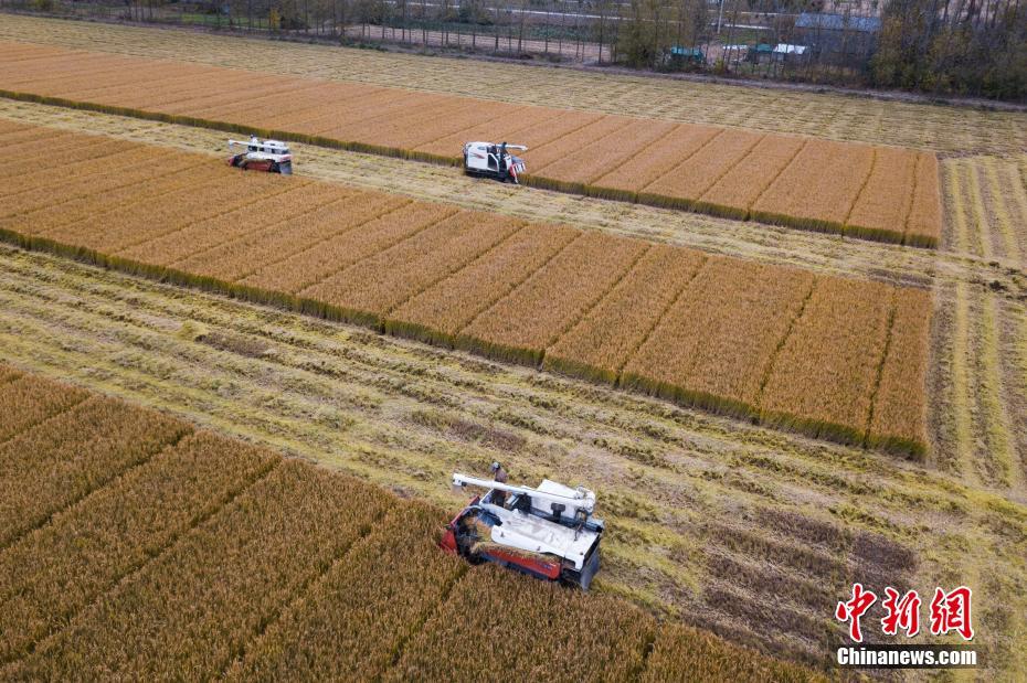 11月12日,航拍江苏淮安郊外田间,收割机正在来回移动收割水稻。眼下正值水稻进入成熟收割期,当地农民纷纷抓住有利天气抢收稻谷,确保颗粒归仓。中新社记者泱波 摄