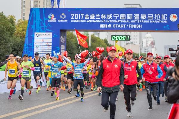 2017金盛兰杯咸宁国际温泉马拉松于11月11日在湖北咸宁温泉成功举行。本次赛事由中国田径协会、湖北省体育局、咸宁市人民政府主办,湖北省田径协会、咸宁市体育局、咸安区人民政府承办,广州市博润文化传播有限公司负责整体运营。赛事得到了社会各界朋友们的关心和支持,全民参与热情度极高,共吸引了来自各地近12000名运动员参赛,其中马拉松报名人数为1699人,半程马拉松报名人数为3000人(报满即止),微型马拉松为7242人,外籍选手人数为9人。观赛人数达10万人,赛事网络点击量达200多万。