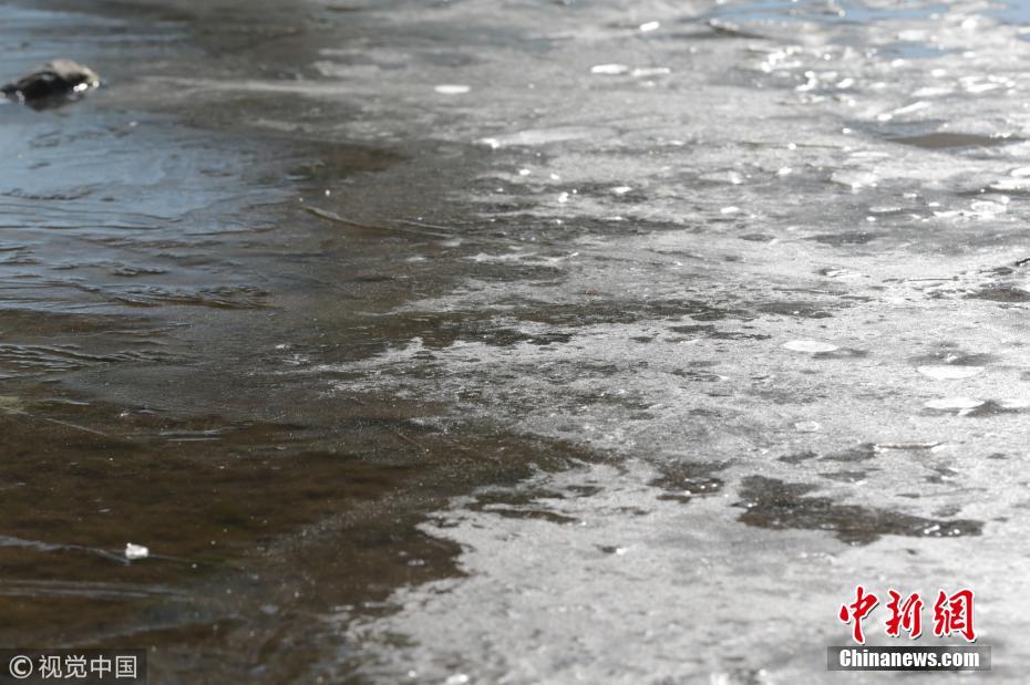 11月14日,北京门头沟区三家店附近,永定河引水渠水面结冰。据现场观察,这处水面为新近结冰,冰层仅几毫米,部分水面尚未冻结,水下还有金鱼游动。宋佳音摄 图片来源:视觉中国