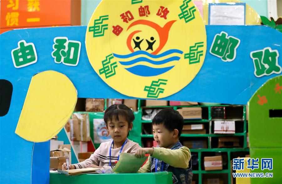 11月15日,山东青岛通济实验学校仇家由和幼儿园的小朋友在进行邮递员工作体验。