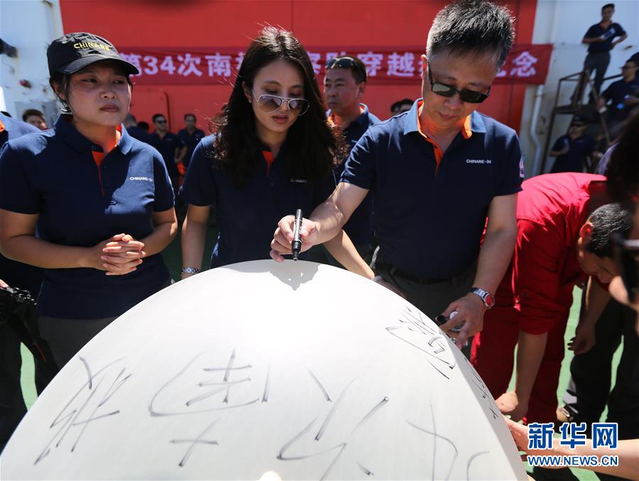 11月15日,在“穿越赤道纪念仪式”上,中国第34次南极科考队队员在即将放飞的气球上写下美好的祝愿。