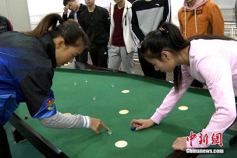 记者14日在西安体育学院地掷球场馆看到,课堂上学员们兴趣浓厚,不时向老师请教弹球技巧。在老师的指导下,学员将弹球放入食指的中间环节位置,把球扣住,大拇指放入球后方,然后弹出,弹球应声进入洞中,周围学员们纷纷拍手叫好。燕武 摄