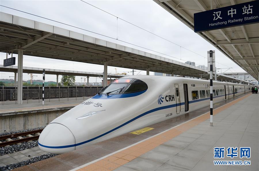 西成高铁试运行列车停靠在汉中站(10月13日摄)。