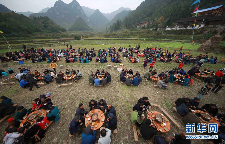 11月19日,在贵州省丹寨县龙泉镇交圭村,村民与游客在稻田里共享酸汤鱼宴。当日,贵州省黔东南苗族侗族自治州丹寨县龙泉镇交圭村举办“百鱼节”民俗活动,村民与游客围坐在收割后的稻田里品尝酸汤鱼宴,共同庆祝丰收。来源:新华社黄晓海 摄