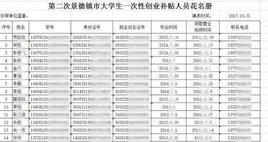 江西省景德镇市政府信息公开网曾于2017年10月31日发布了《第二批大学生一次性创业补贴公示》,公示单位为景德镇市劳动就业服务管理局,责任部门为景德镇市人力资源和社会保障局。其中,可供民众下载的文件公布了学生姓名、完整身份证号以及联系电话等。