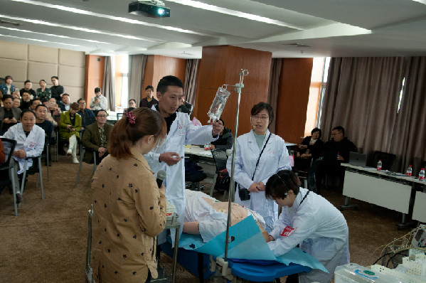 三线医生被蒙上眼睛,背对急救台,模拟场外遥控指挥的情景,电话调度下级医生进行现场急救。11月15日,湖北省宜昌市中心医院第三教室,一场别开生面的培训课程正在进行,来自该市 10多家市县级医院的急诊医生代表在此聚集,参加由湖北省急诊医学质量控制中心和武大中南医院急救中心开办的“急诊医师综合能力训练课程“,该课程引入高仿真模拟人,在模拟临床环境中,让学员体验急诊临床思维和急诊诊疗训练的过程,突出实战操练,以期更好地提升急诊医师的临床综合能力。