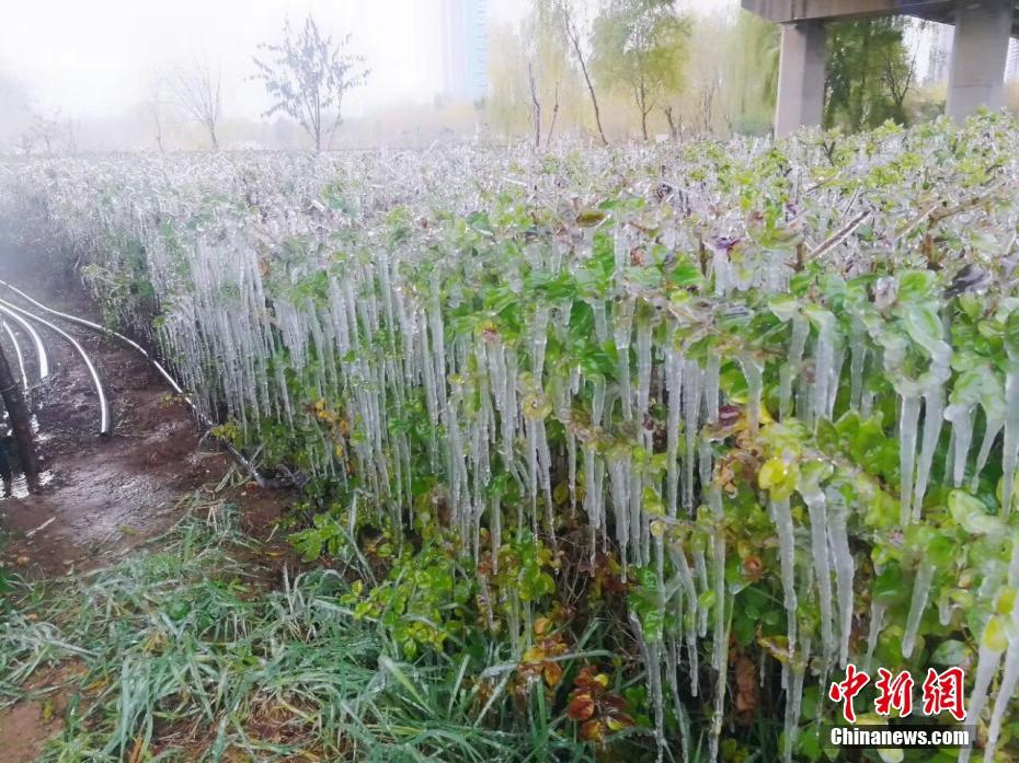 被冬灌的植物上凝结出冰挂景观。彭伟 摄
