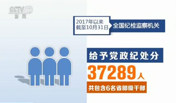 2017年以来,截至10月31日,全国纪检监察机关共查处违反中央八项规定精神问题37824起,处理53195人,给予党政纪处分37289人,在给予党政纪处分的人中,共包含6名省部级干部。