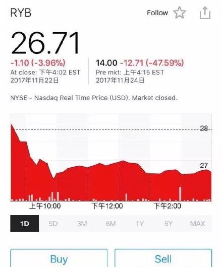 红黄蓝北京新天地幼儿园22日被爆存在“虐童”等行为,引起舆论讨伐。美国股市感恩节(23日)休市翌日,北京时间24日晚10时30分开盘时,红黄蓝教育低开41%,跌破发行价18.5美元,市值仅剩4亿多美元。
