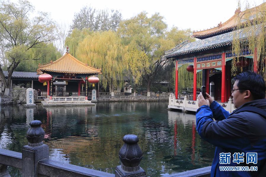 11月28日,游客拍摄喷涌乏力的济南趵突泉。当日,山东济南趵突泉水位为27.93米,已连续11天处于28米的橙色警戒线以下。今年以来,泉城济南受汛期降雨偏少等因素影响,地下水补给明显不足,汛期后地下水位持续走低。新华社发(吕传泉 摄)