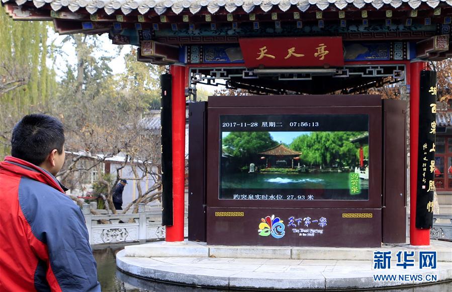 11月28日,游人在济南天尺亭观看趵突泉实时水位。当日,山东济南趵突泉水位为27.93米,已连续11天处于28米的橙色警戒线以下。今年以来,泉城济南受汛期降雨偏少等因素影响,地下水补给明显不足,汛期后地下水位持续走低。新华社发(吕传泉 摄)