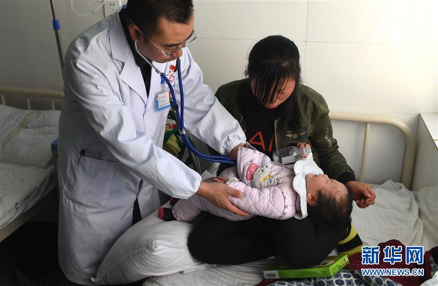 云南省鲁甸县龙头山镇中心卫生院的医生范怀庆(左)为一名幼童检查(11月29日摄)。