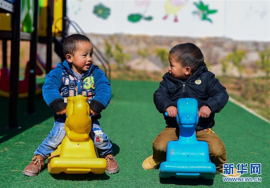 在云南省鲁甸县火德红镇,已经3岁多的“地震宝宝”肖致震(右)和祖世建在一起玩耍(11月28日摄)。